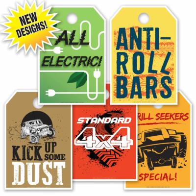 This tag measuring 3½” x 8″ will easily slip into tight places to help promote your sales and promotional events. Choose from 4 stock designs. Red ink on white card stock. Hole is approximately 1½” in diameter.